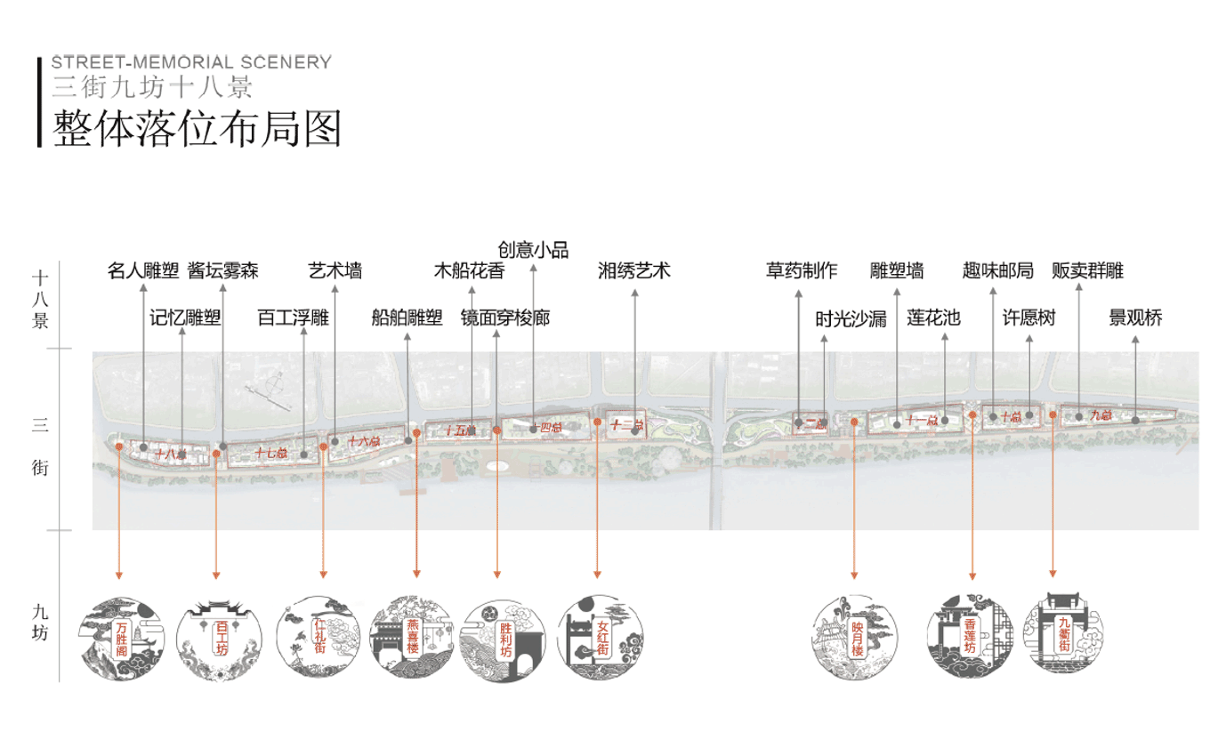三街九坊十八景標識系統規劃設計,十八景是服務于老街業態的文化亮點,是以烘托繁榮商貿氛圍、高度還原文獻記載、展現當地民俗文化、形成完整的一條具有歷史文化的老街故事。